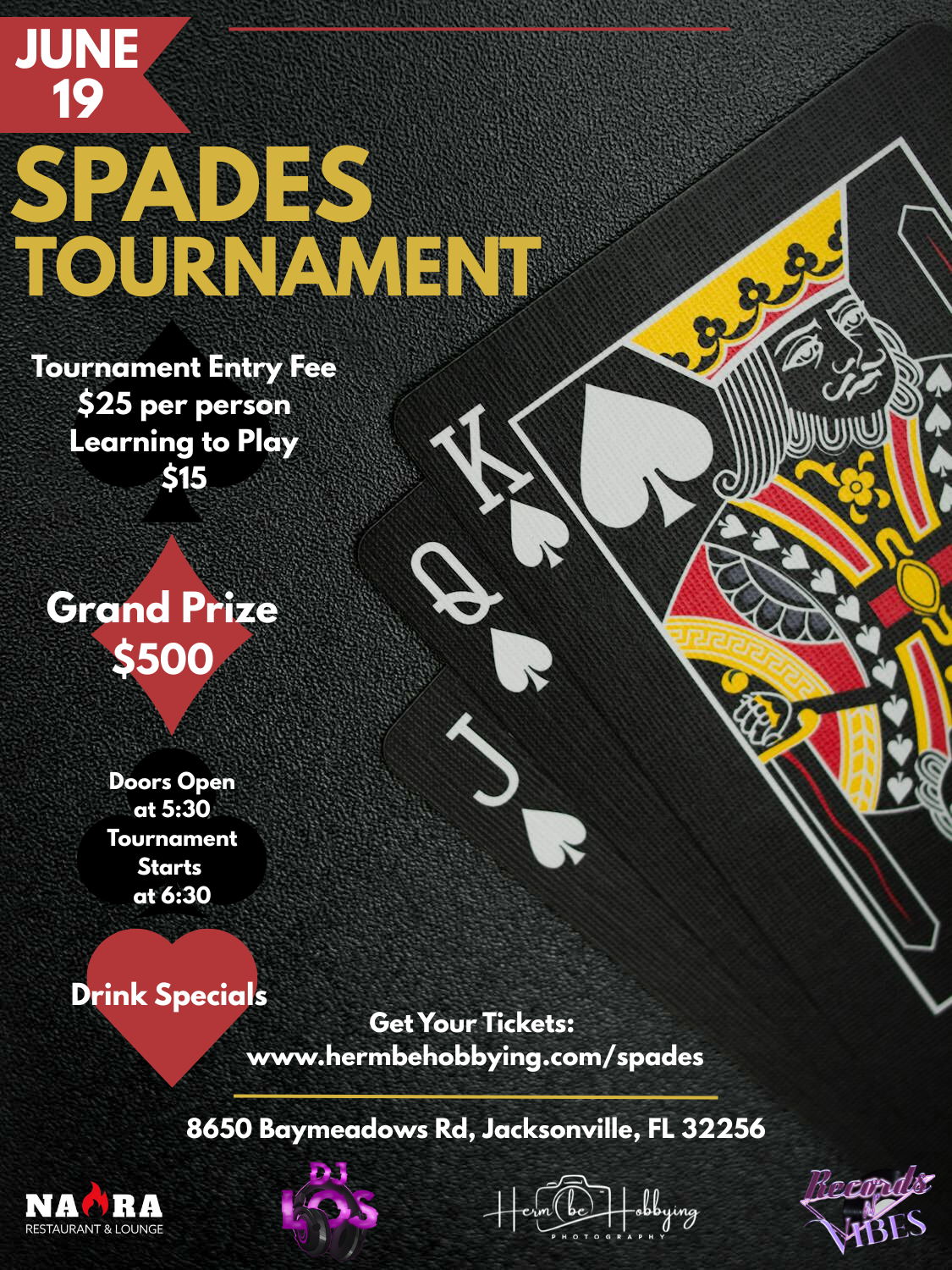 Get ready for some fun and friendly competition! DJ Los, Records N Vibes, Herm Be Hobbying and Nara Restaurant and Lounge is hosting a Spades Tournament, with a $500.00 cash prize for the winning team!